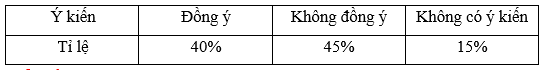 b) Lập bảng thống kê cho biết tỉ lệ phần trăm đồng ý, không đồng ý và không có ý kiến.