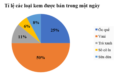 Biểu đồ hình quạt tròn cho biết tỉ lệ các loại kem bán được trong một ngày của một cửa