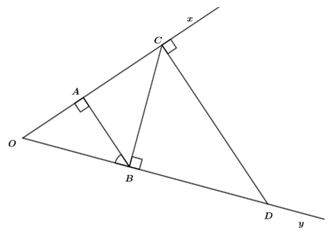Cho \(\angle xOy\) điểm \(A\) thuộc tia \(Ox.\) Kẻ \(AB\) vuông góc với \(Ox\,\left( {B \in Oy} \right),\) kẻ \(BC\) vuông góc với \(Oy\,\left( {C \in Ox} \right),\) kẻ \(CD\) vuông góc với \(Ox\,\left( {D \in Oy} \right).\) Chứng minh \(\angle ABO = \angle ACB\) và \(\angle ACB = \angle CDO\).