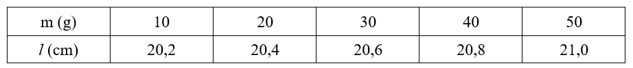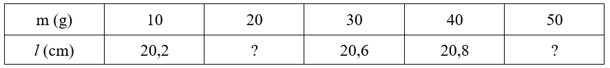 Một lò xo treo thẳng đứng có chiều dài ban đầu \({l_0} = 20cm\). Chiều dài l của lò xo khi bị kéo dãn bởi các vật treo có khối lượng m khác nhau được cho trong bảng dưới đây. Hãy cho biết các độ lớn cần ghi vào các ô có dấu (?).