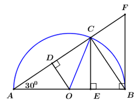 Cho nửa đường tròn tâm O bán kính 3cm, có đường kính AB. Gọi C là điểm thuộc nửa đường tròn sao cho \(AC > BC\). Vẽ OD vuông góc với AC (D thuộc AC) và CE vuông góc với AB (E thuộc AB). Tiếp tuyến tại B của nửa đường tròn cắt tia AC tại F.
