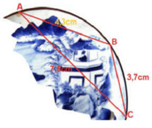 Trong khi khai quật một ngôi mộ cổ, các nhà khảo cổ học đã tìm được một chiếc đĩa cổ hình tròn bị vỡ, các nhà khảo cổ muốn khôi phục lại hình dạng chiếc đĩa này. Để xác định bán kính của chiếc đĩa, các nhà khảo cổ lấy 3 điểm trên chiếc đĩa và tiến hành đo đạc thu được kết quả như hình vẽ (AB = 4,3 cm, BC = 3,7 cm, CA = 7,5 cm). Bán kính của chiếc đĩa này bằng (kết quả làm tròn tới hai chữ số sau dấu phẩy).