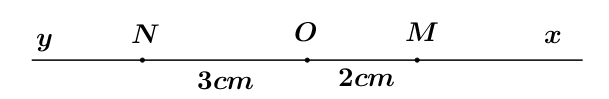 Cho điểm O nằm trên đường thẳng xy. Gọi M là điểm nằm trên tia Ox và cách O một khoảng bằng 2cm. Gọi N là điểm nằm trên tia Oy và cách O một khoảng bằng 3 cm.