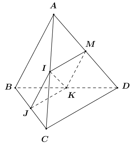 Cho tứ diện ABCD. Gọi I, J, K lần lượt là trung điểm của AC, BC, BD. Giao tuyến của hai mặt