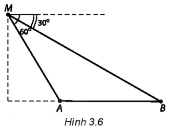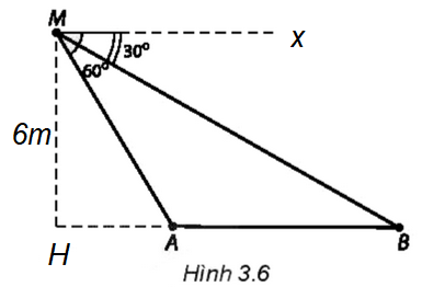 Một người đứng trên đài quan sát đặt ở cuối một đường đua thẳng. Ở độ cao 6 m so với mặt đường đua, tại một thời điểm người đó nhìn hai vận động viên A và B dưới các góc tương ứng là 60° và 30°, so với phương nằm ngang (H.3.6). Khoảng cách giữa hai vận động viên A và B (làm tròn đến hàng đơn vị, theo đơn vị mét) tại thời điểm đó là