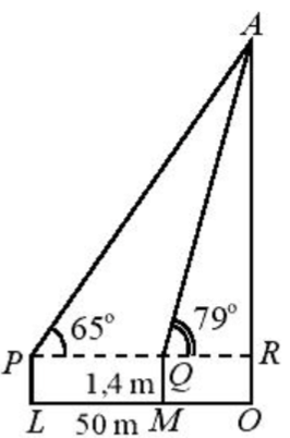 Để xác định chiều cao của một toà nhà cao tầng, một người đứng tại điểm M, sử dụng giác kế nhìn thấy đỉnh toà nhà với góc nâng \(\angle RQA = {79^0}\), người đó lùi ra xa một khoảng cách LM = 50 m thì nhìn thấy đỉnh toà nhà với góc nâng \(\angle RPA = {65^0}\). Hãy tính chiều cao của toà nhà (làm tròn đến chữ số thập phân thứ nhất), biết rằng khoảng cách từ mặt đất đến ống ngắm của giác kế đó là PL = QM = 1,4m.