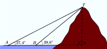 Các góc nhìn đến đỉnh núi so với mực nước biển được đo từ hai đèn tín hiệu A và B trên biển được thể hiện trên hình vẽ. Nếu các đèn tín hiệu cách nhau \(1536\) m thì ngọn núi cao bao nhiêu (tính gần đúng sau dấu phẩy hai chữ số)?
