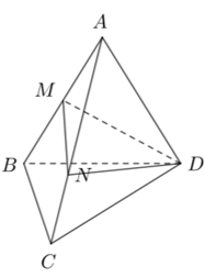 Cho tứ diện \(ABCD\), trên các cạnh \(AB,\,\,AC\) lấy hai điểm \(M,\,\,N\) sao cho \(AM = BM\) và \(AN =