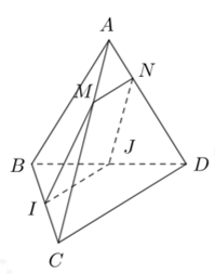 Cho tứ diện \(ABCD\). Gọi hai điểm \(I,\,\,J\) lần lượt là trung điểm của \(BC,\,\,BD\), mặt phẳng \(\left( P \right)\) đi qua \(IJ\) cắt các cạnh \(AC,\,\,AD\) lần lượt tại \(M,\,\,N\). Mệnh đề nào dưới đây là đúng?
