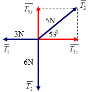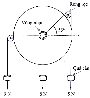 Một học sinh kiểm tra lại quy tắc tổng hợp lực đồng quy bằng cách bố trí thí nghiệm với các quả cân, ròng rọc, dây nối và một vòng nhựa mảnh, nhẹ. Lúc đầu vòng được giữ như hình vẽ. Khi vừa thả ra thì vòng chuyển động. Học sinh này đổi các quả cân có trọng lượng P vào dây treo 6N thì hệ thống cân bằng khi thả ra. Tính P.