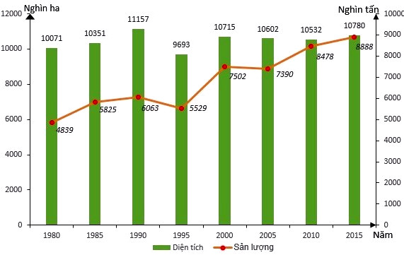 Nhận xét về diện tích và sản lượng cà phê trên thế giới giai đoạn 1980 - 2015?