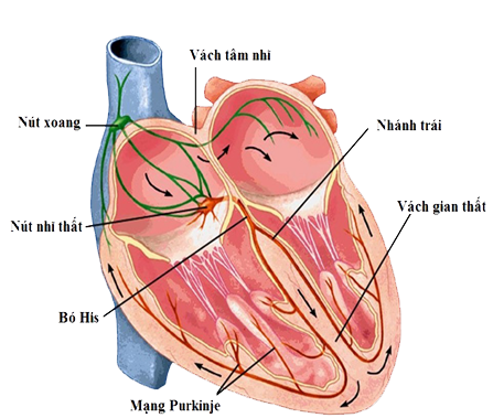 Nút xoang nhĩ tự phát xung điện → Lan ra khắp cơ tâm nhĩ → Tâm nhĩ co → Lan truyền đến nút nhĩ thất → Bó His → Mạng lưới Puockin → Lan khắp cơ tâm thất → Tâm thất co