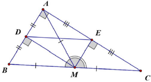 Cho tam giác ABC vuông tại A, có \(AM = \dfrac{1}{2}BC\left( {M \in BC} \right).\) Dựng hai đường phân giác của góc AMB, AMC lần lượt cắt AB, AC tại D, E. Số các cặp vectơ cùng hướng là