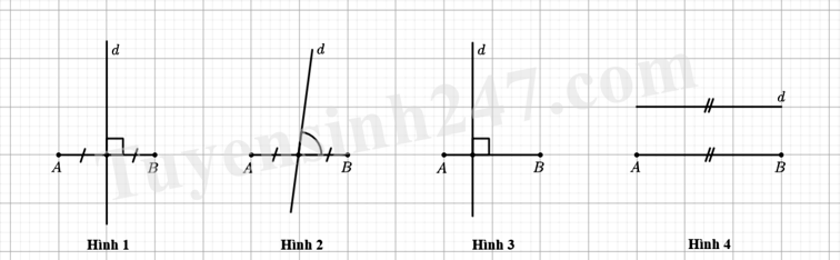 Đường thẳng \(d\) trong hình nào dưới đây là trung trực của đoạn thẳng \(AB?\)
