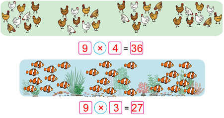 Quan sát tranh và viết phép nhân thích hợp với mỗi tranh.