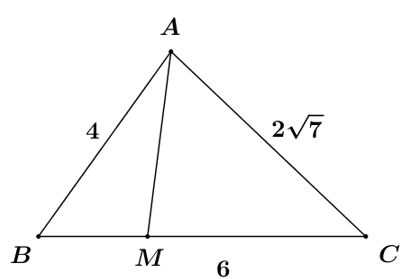 Tam giác ABC có AB = 4, BC = 6, \(AC = 2\sqrt 7 \). Điểm M thuộc đoạn BC sao cho MC = 2MB. Tính độ dài