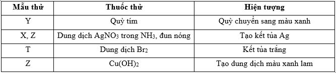 Tiến hành thí nghiệm với các dung dịch X, Y, Z và T. Kết quả được ghi ở bảng sau: