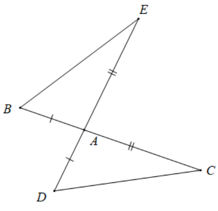 Cho hai đoạn thẳng \(BC\) và \(DE\) cắt nhau tại \(A\) sao cho \(AB = AD\), \(AE = AC\) và \(AB < AC\). Phát biểu nào trong các phát biểu sau là sai.