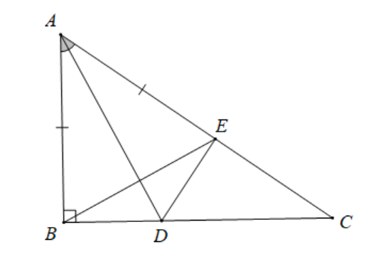 Cho \(\Delta ABC\) có \(\angle B = 90^\circ ,\angle A = 50^\circ \). Tia phân giác \(AD\) của góc \(A\)\(\left( {D \in BC} \right)\). Trên cạnh \(AC\) lấy điểm \(E\) sao cho \(AE = AB\). Tính số đo góc \(\angle EDC\).