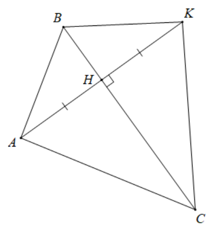 Cho tam giác \(ABC\), kẻ \(AH\) vuông góc với \(BC,\left( {H\; \in BC} \right)\). Trên. tia đối của tia \(HA\) lấy điểm \(K\) sao cho \(HK = HA\), nối \(KB,KC\). Tìm các cặp tam giác bằng nhau.