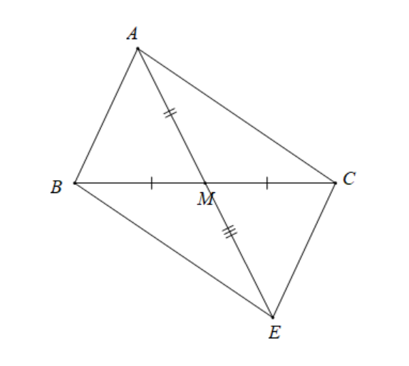 Cho\(\Delta ABC\), \(M\) là trung điểm của \(BC\). Trên tia đối của tia \(MA\) lấy điểm \(E\) sao cho \(ME = MA\). Chứng minh: