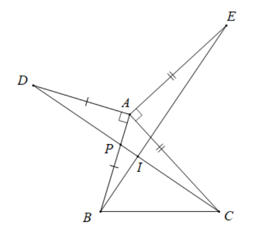 Cho tam giác \(ABC\) nhọn. Vẽ đoạn thẳng \(AD\)vuông góc với \(AB\)và \(AD = AB\)(\(D,\;C\)khác phía so với \(AB\)). Vẽ đoạn thẳng \(AE\) vuông góc với \(AC\) và \(AE = AC\)(\(E,B\) khác phía so với \(AC\)). Chứng minh:
