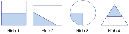 Quan sát các hình xem hình nào được chia thành 2 phần bằng nhau và tô màu 1 phần.