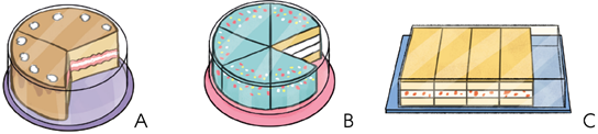 Tuấn đã ăn \(\dfrac{1}{3}\) chiếc bánh, Khang đã ăn \(\dfrac{1}{5}\) chiếc bạn. Minh đã ăn \(\dfrac{1}{6}\) chiếc bánh. Theo em mỗi bạn đã ăn phần bánh của chiếc bánh nào dưới đây?
