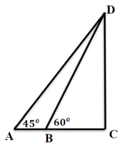 Ta cần đo chiều cao một tháp. Đặt chân tháp là C, đỉnh tháp là D. Vì không thể đến chân tháp nên từ hai điểm A, B có khoảng cách AB = 30m sao cho A, B, C thẳng hàng, B nằm giữa A và C người ta đo được các góc \(\angle CAD = {45^0}\), \(\angle CBD = {60^0}\). Hãy tính độ dài chiều cao CD của tháp (làm tròn đến 2 chữ số thập phân).