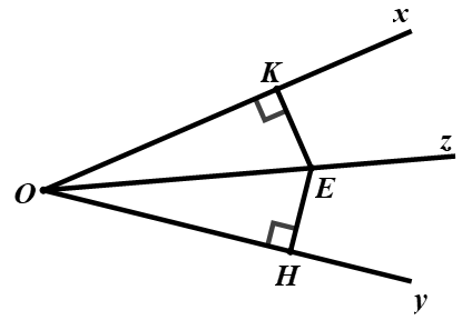 Cho góc nhọn \(xOy,Oz\) là tia phân giác của góc. Trên tia \(Oz\) lấy điểm \(E\), vẽ đường thẳng vuông góc với \(Ox\) tại \(K\), vuông góc với \(Oy\) tại \(H\). Chọn câu đúng.