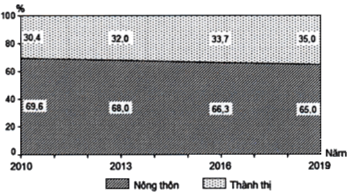 Cho biểu đồ về dân số nông thôn và thành thị của nước ta giai đoạn 2010 - 2019: