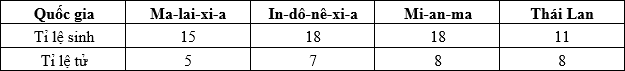 Cho bảng số liệu: TỈ LỆ SINH VÀ TỈ LỆ TỬ CỦA MỘT SỐ QUỐC GIA, NĂM 2018 (Đơn vị:
