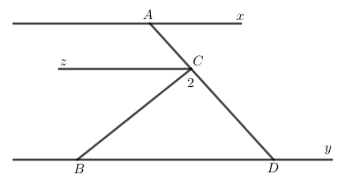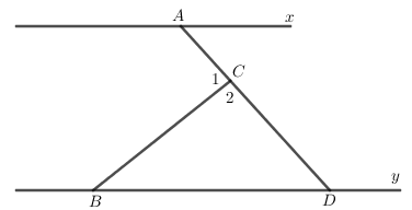 Cho hình vẽ, biết \(Ax//By,\angle xAC = 55^\circ ,\angle CBD = 35^\circ \). Tính số đo các góc \(\angle {C_1},\angle {C_2},\angle D\)?