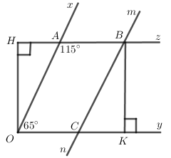 Cho \(\angle xOy = 65^\circ \). Qua điểm \(A\) trên tia \(Ox\) kẻ tia \(Az\) sao cho \(\angle OAz = 115^\circ \). Qua điểm \(B\) trên tia \(Az\) kẻ đường thẳng \(mn\) cắt \(Oy\) tại \(C\) sao cho \(\angle mBz = 65^\circ \). Kẻ \(OH\) vuông góc với \(Az\) tại \(H\) và \(BK\) vuông góc với \(Oy\) tại \(K\)