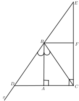Cho \(\Delta ABC\) vuông tại \(A\). Vẽ tia \(Bx\) sao cho \(BA\) là tia phân giác của \(\angle CBx\). Tia này cắt \(AC\) tại \(D\). Qua \(C\) vẽ đường thẳng vuông góc với \(AC\); đường thẳng này cắt đường thẳng \(BD\) tại \(E\). Tia phân giác của \(\angle CBE\) cắt \(CE\) tại \(F\). Chứng minh rằng: