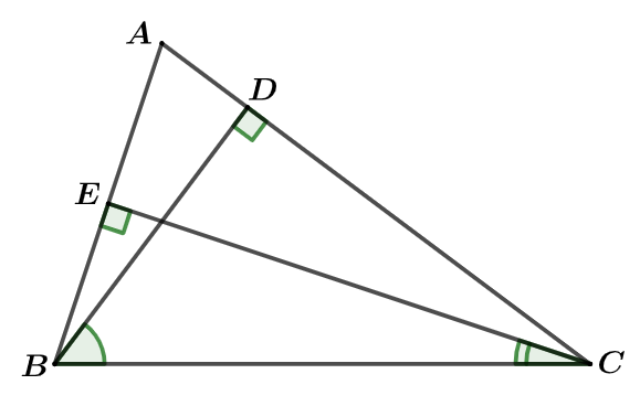Cho \(\Delta ABC\) có ba góc nhọn, \(AB < AC.\) Kẻ \(BD\) vuông góc với \(AC\) tại \(D,\) \(CE\) vuông góc với \(AB\) tại \(E.\) So sánh \(\angle DBC\) và \(\angle ECB.\)