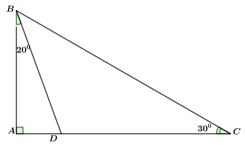 Cho tam giác \(ABC\) vuông tại \(A,\,\,\angle C = {30^0}.\) Điểm \(D \in AC\) sao cho \(\angle ABD = {20^0}.\)