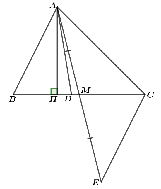Cho tam giác \(\Delta ABC\) có \(\left( {AB < AC} \right)\) và \(AD\) là tia phân giác của góc \(A\,\left( {D \in BC} \right).\) Kẻ \(AH\) vuông góc với \(BC\,\left( {H \in BC} \right)\) và gọi \(M\) là trung điểm của cạnh \(BC.\) Chứng minh rằng: \(\angle CAM < \angle CAD < \angle CAH.\)