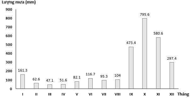 Theo biểu đồ trên, tháng có lượng mưa trên 200mm ở Huế diễn ra từ