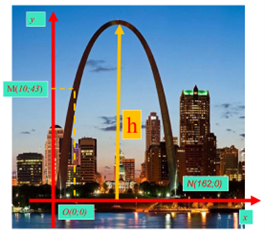 Khi du lịch đến thành phố Xanh Lu-I (Mĩ), ta sẽ thấy một cái cổng lớn có hình parabol hướng bề lõm xuống dưới, đó là cổng Ac-xơ. Khoảng cách giữa hai chân cổng là \(162m\). Từ một điểm trên thân cổng người ta đo được khoảng cách tới mặt đất là \(43\,m\) và khoảng cách tới điểm chân cổng gần nhất là \(10\,m\). Chiều cao của cổng gần với số nào sau đây?