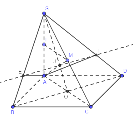 Tìm thiết diện của \(\left( \alpha \right)\)với hình chóp. Xác định tâm I đi qua 5 điểm S, A, E, M, F bằng cách xác định các tam giác vuông và dùng đường trung tuyến bằng ½ cạnh huyền.
