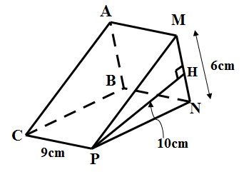 Tính thể tích của khối lăng trụ đứng ABC. MNP ở hình vẽ sau, trong đó PC = 9cm, MN = 6cm, PH = 10cm.