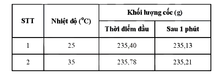 Lặp lại thí nghiệm khi nhiệt độ phòng là 350C. Kết quả thí nghiệm được ghi trong bảng sau: