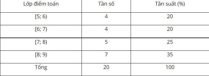 Thống kê điểm toán của 20 học sinh của một lớp người ta thu được mẫu số liệu ban đầu