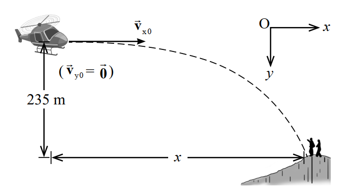 Một chiếc máy bay muốn thả hàng tiếp tế cho những người leo núi đang bị cô lập. Máy bay đang bay ở độ cao 235 m so với vị trí đứng của những người leo núi với tốc độ 250 km/h theo phương ngang (hình vẽ). Máy bay phải thả hàng tiếp tế ở vị trí cách những người leo núi bao xa để họ có thể nhận được hàng? Lấy \(g = 9,8\,\,m/{s^2}\) và bỏ qua lực cản không khí.