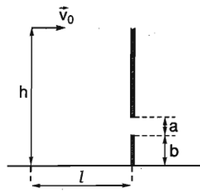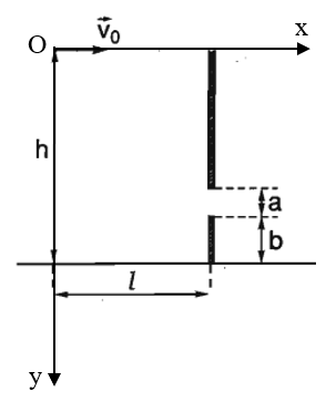 Từ một điểm ở độ cao h = 18 m so với mặt đất và cách tường nhà một khoảng l = 3 m, người ta ném một hòn sỏi theo phương nằm ngang với vận tốc ban đầu \({v_0}\). Trên tường có một cửa sổ có chiều cao a = 1 m, mép dưới cửa sổ cách mặt đất một khoảng b = 2 m (hình vẽ). Hỏi giá trị của \({v_0}\) phải nằm trong giới hạn nào để hòn sỏi lọt qua cửa sổ? Bỏ qua bề dày của bức tường.