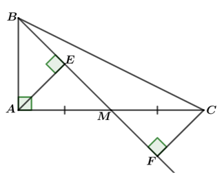 Cho \(\Delta ABC\) vuông tại \(A,\) điểm \(M\) là trung điểm của \(AC.\) Gọi \(E\) và \(F\) là chân
