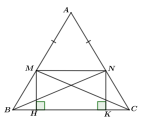 Cho \(\Delta ABC\) cân tại \(A,\) trên hai cạnh \(AB\) và \(AC\) lấy hai điểm \(M\) và \(N\) sao cho \(AM = AN.\) Chứng minh rằng: \(BN > \dfrac{{BC + MN}}{2}\).