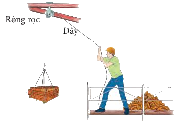 Hình vẽ mô tả quá trình kéo gạch từ thấp lên cao qua hệ thống ròng rọc. Xem chuyển động