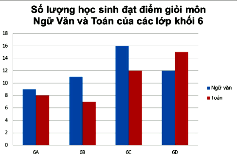 Cho biểu đồ thể hiện số học sinh đạt điểm giỏi môn Ngữ văn và Toán của các lớp khối 6